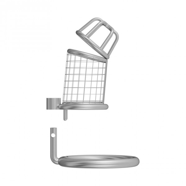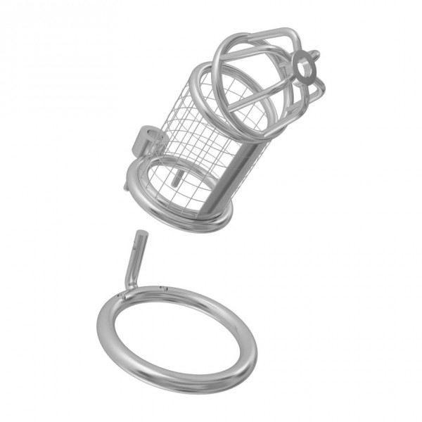Выпол­нен пояс вер­но­сти из хирургической стали - абсо­лютно гипо­ал­лерген­ного мате­ри­ала. Ствол закрыт металлической сеткой, на головке решетка, кото­рая создает вен­ти­ляцию и создана для комфорт­ного моче­испус­ка­ния. Эрекци­он­ное метал­ли­че­ское кольцо с надеж­ным зам­ком удержи­вает кон­струкцию на теле мужчины!